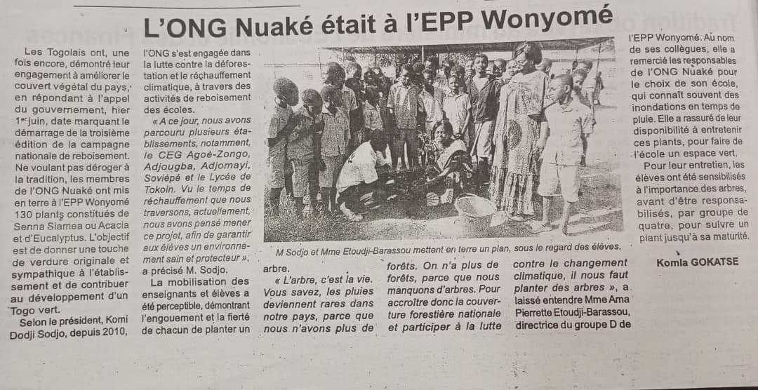 Cette année, l’ONG Nuaké était à nouveau participante dans le cadre de la Journée Nationale de l’Arbre, à Lomé. C’est l’EPP Wonyomé qui a été choisie cette année pour la mise en terre de 130 plants qui seront accompagnés par des élèves jusqu’à leur maturité.